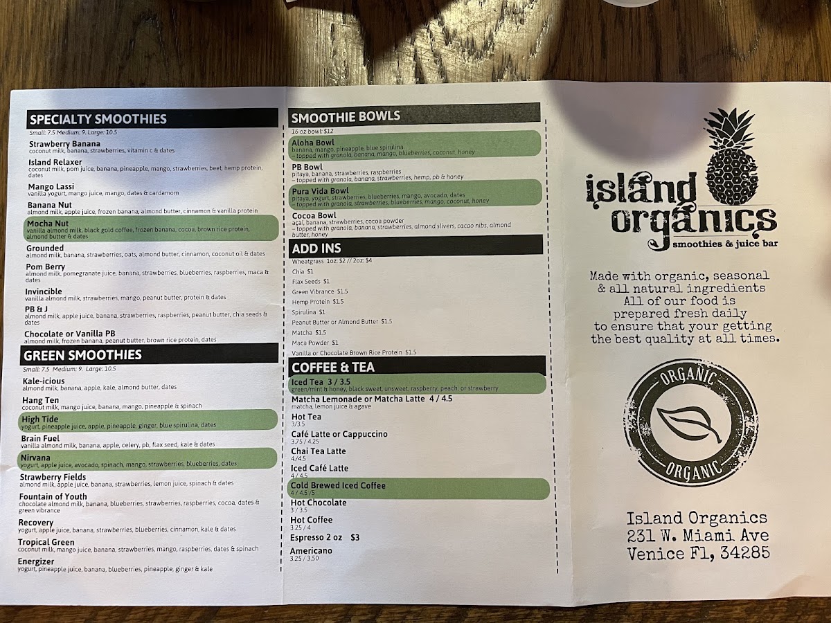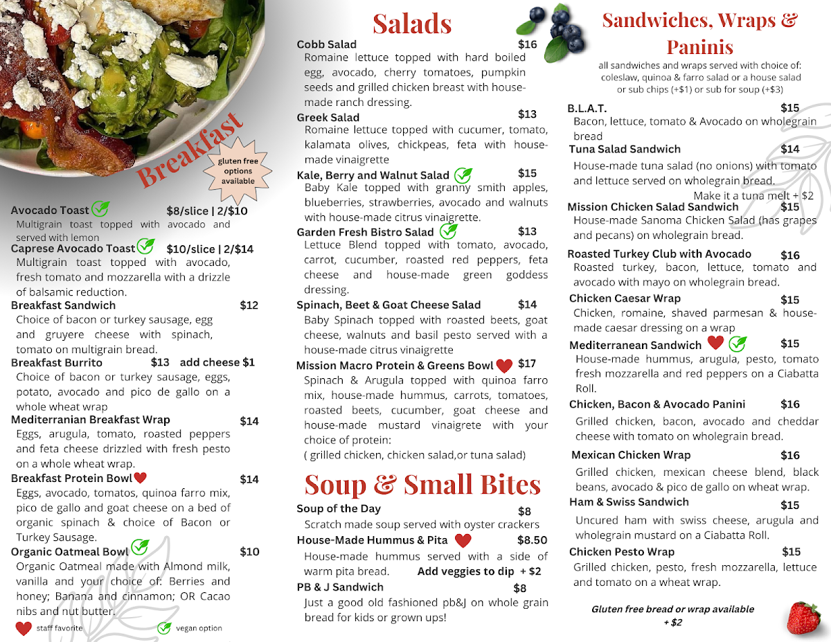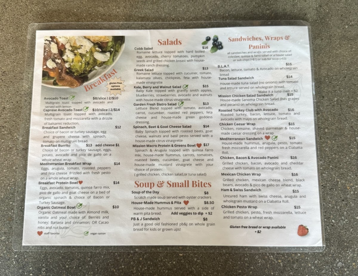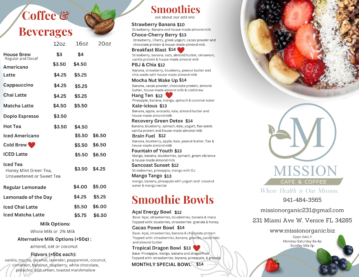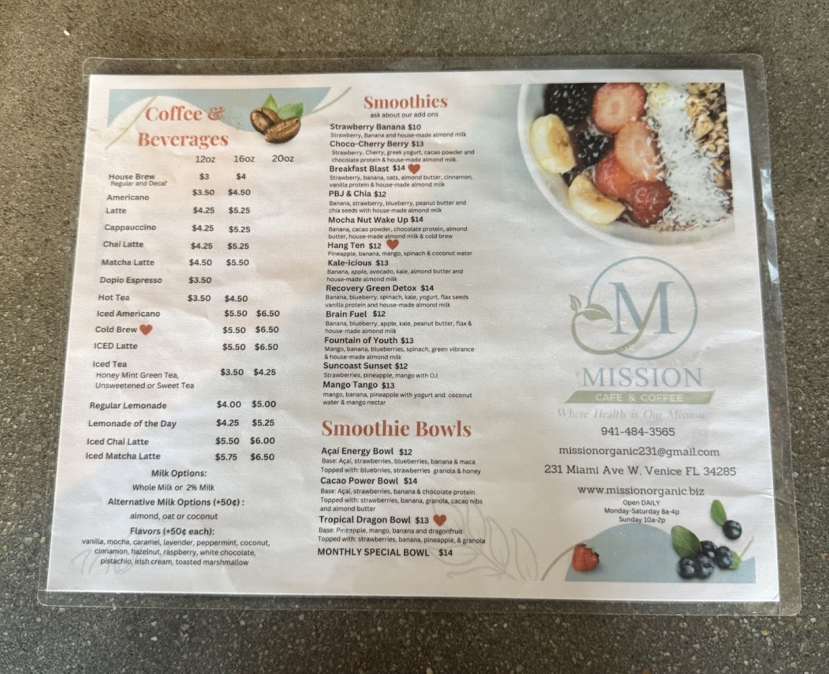 Welcome to Mission Cafe & Coffee, where health meets flavor on the sunny shores of Venice, Florida. This charming cafe, located at 231 Miami Ave W, focuses on organic ingredients, creating a menu that caters to both coffee lovers and health-conscious diners. Start your day with a steaming cup of their delicious hot coffee or a refreshing hot tea, each priced at $3.00. For those looking to indulge in something unique, the fall specials include a delightful pumpkin smoothie and a wholesome soup with egg bites, perfect for those crisp autumn mornings.